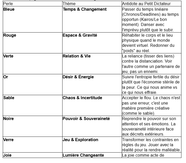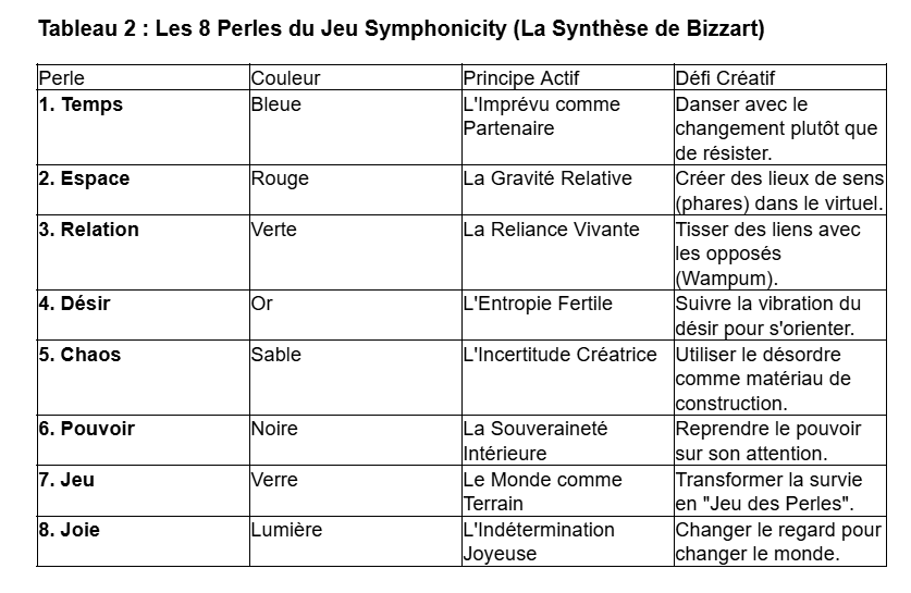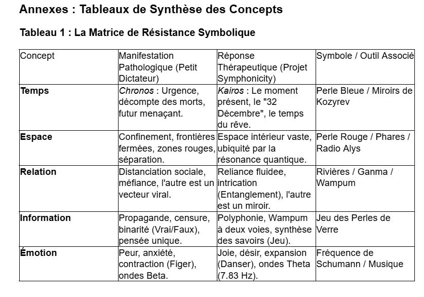 Le 8 décembre 2019 a lancé un défi titanesque à l’humanité : non seulement survivre à un virus, mais survivre à la peur de ce virus. Le Projet Symphonicity, armé de perles de verre, de coquillages Wampum, de légendes de rivières et d’ondes radio imaginaires, a relevé ce défi. Il a démontré que face à l’effondrement du sens, la réponse n’est pas technique mais poétique et symbolique. En réactivant les anciennes technologies de la reliance (l’eau, le cercle, le feu), il a offert un modèle de résilience où le « pire » (le petit dictateur) est transmuté en « meilleur » (la symphonicité) par l’alchimie de la rencontre et du jeu. Dans le grand Wampum de l’histoire humaine, les perles de cette période seront indubitablement violettes de douleur, mais grâce à des initiatives comme celle-ci, elles seront alternées de perles blanches de lumière, témoignant que même au cœur de la nuit, les phares ont continué de tourner et la rivière a continué de chanter.